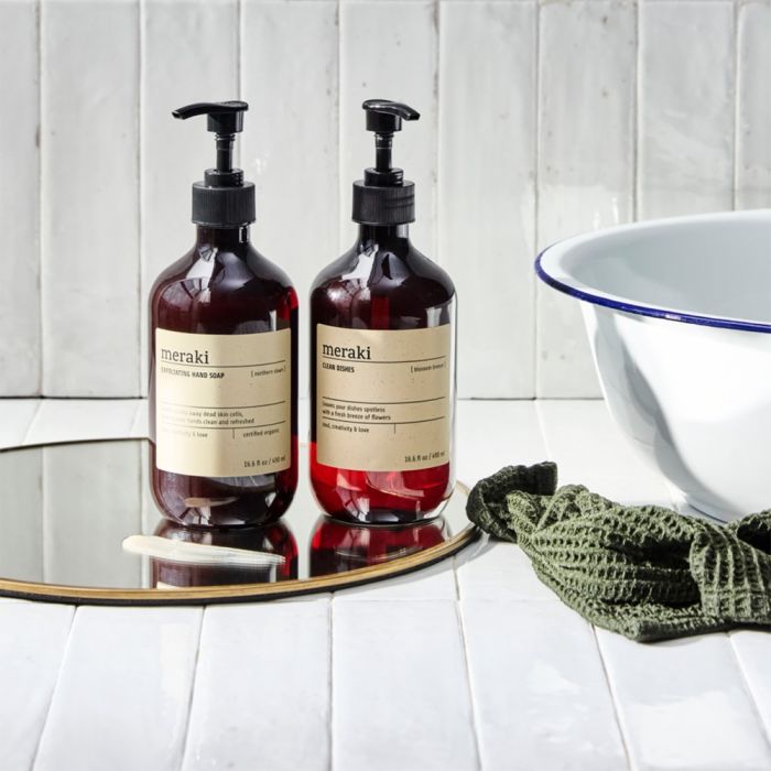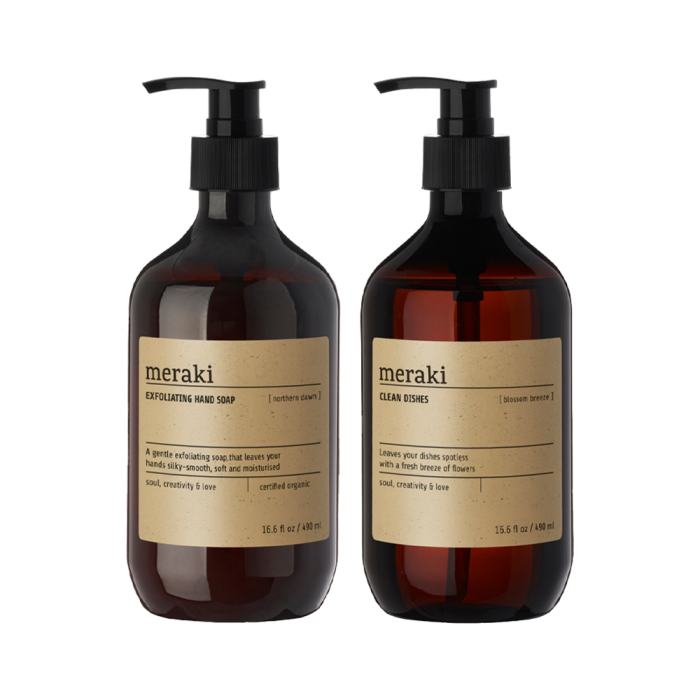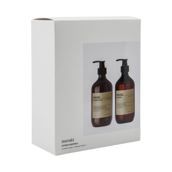 Meraki Kitchen Essentials gåvoset innehåller två uppskattade produkter för köket, båda i de välkända bruna Meraki-flaskorna med pump och 490 ml. Setet består av ett ekologiskt certifierat och Svanenmärkt diskmedel samt en exfolierande handtvål, som tillsammans ger en vårdande och behaglig upplevelse i vardagen. Diskmedlet har en frisk och blommig ton, som sprider ren känsla i köket, medan handtvålen lämnar huden mjuk och återfuktad med sin silkiga formula. Produkterna är utvecklade med omtanke för både hud och miljö och passar utmärkt i det moderna hemmet. Gåvosetet är en fin värdinnegåva, inflyttningspresent eller omtänksam hälsning till någon som uppskattar kvalitet och välbefinnande.