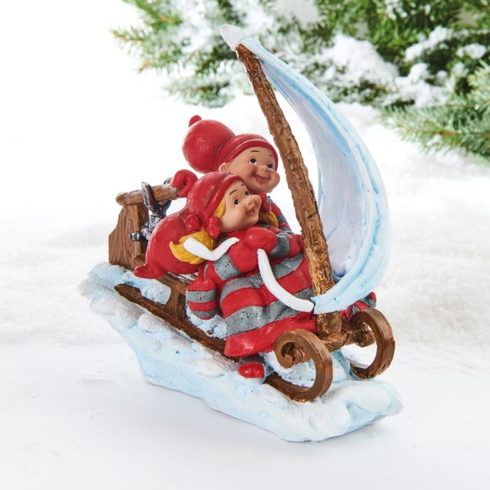 Det är fart på i tomteboet! Bäbistomtarna på kälke med segel susar nerför snöbacken i full fart medan snön yr omkring dem. Med vinden i luvorna, stora leenden och massor av tomteglädje är de på väg ut i julens äventyr. Figurerna är tillverkade i polyresin med fina detaljer och glada färger som fångar rörelsen och energin i scenen. De passar perfekt som en livlig del av ett tomtelandskap eller som en rolig och stämningsfull juldekoration på en hylla eller i fönstret. Bäbistomtarna är designade av Susanna Hartmann för danska Pobra, kända för sitt klassiska och nostalgiska tomteuniversum med älskade tomtar i rött och grått. En lekfull och livlig julfigur som sprider fart, glädje och massor av julstämning i hemmet.