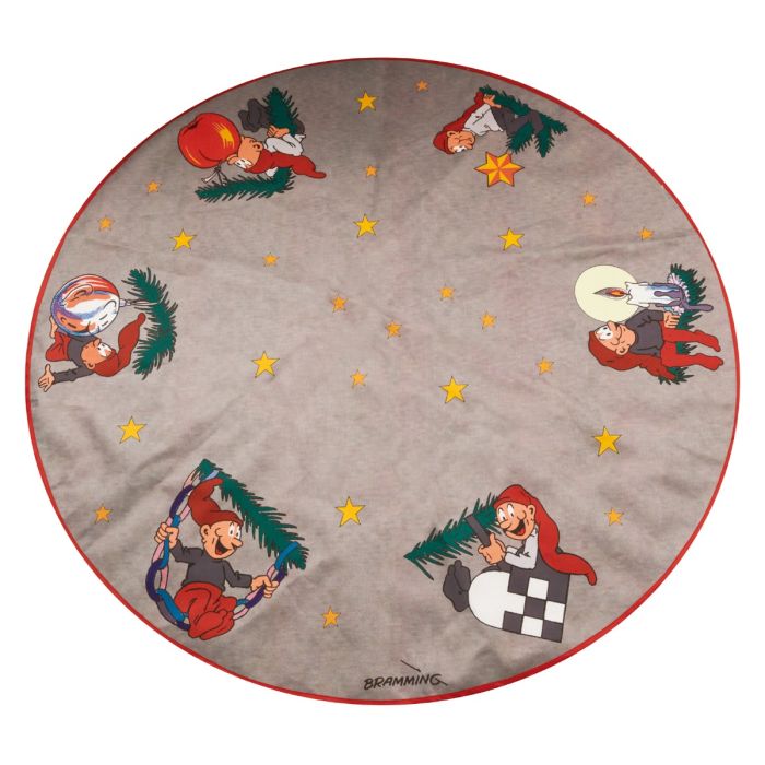 Här får du en av Pobras mest älskade julklassiker, en julgransmatta som samlar hela familjens julstämning på en enda rund yta. Den fina mattan är dekorerad med de välkända Brammingtomtarna, som sitter och hänger på sina grankvistar medan små gula stjärnor lyser som vinterkvällens stilla himmel. Varje tomte är tecknad i Arne Brammings varma och humoristiska stil, och deras glada uttryck har i generationer gjort dem till återkommande gäster i svenska hem. Motiven väcker minnen om gamla julberättelser där tomtarna hjälper till med pynt, lekar och små bus när decembermörkret sänker sig. Mattan är tillverkad i tyg med klassiskt rött kantband och mäter 110 cm i diameter. Ett traditionsrikt val som skapar en mysig bas för julklappar, pynt och granens varma sken.
