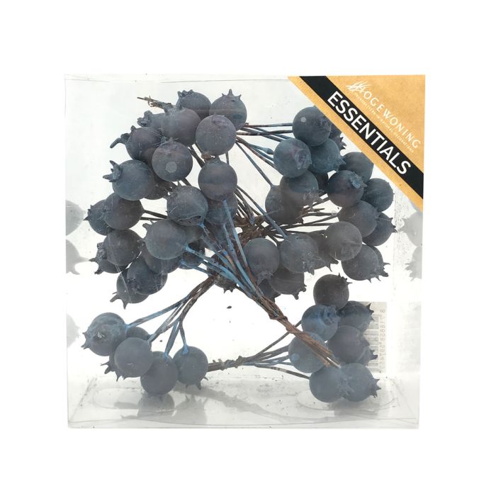 Blåbär på tråd. Små, svarta konstgjorda blåbär är naturtrogen med en metalltråd för att sticka in i kransen, oasisen, leran, jorden etc. Blåbären sitter i kvistrar om 8 stycken. Det finns 8 kvistrar i en låda. Tillverkade av frigolit och metall.
