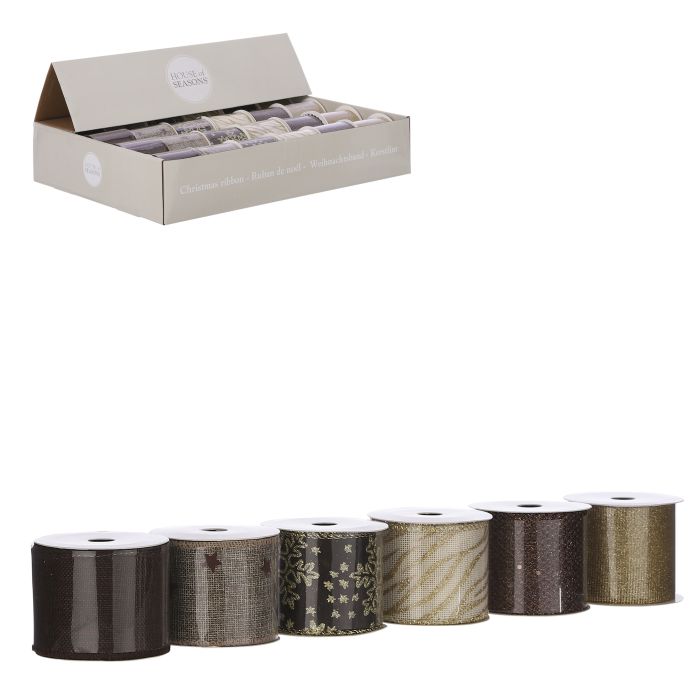 Dekorationsband i vackra bruna nyanser med metall i kanten. Dekorationsbandet är mycket lämpligt för att forma vackra rosetter till exempelvis adventskransen.