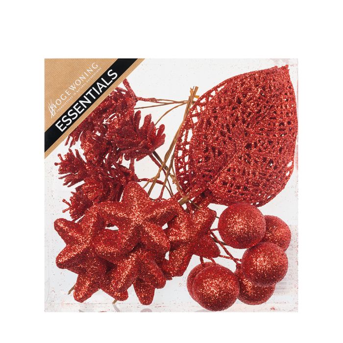 Dekorationsmix i rött, bestående av kulor, löv, stjärnor och kottar, allt i en gnistrande röd färg. Dekorobjektet är försett med små metalltrådar. Det finns 6 stycken av varje variant i förpackningen.