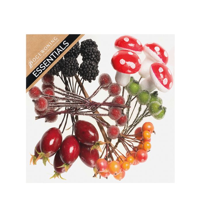 Höstmix på tråd består av röda och vita svampar samt bär i många olika färger. Ask innehåller 7 varianter. Alla har en liten metalltråd för att sättas in i kransen, oasisen, leran, jorden etc. Använd höstmix för att skapa din personliga höst- eller juldekoration.