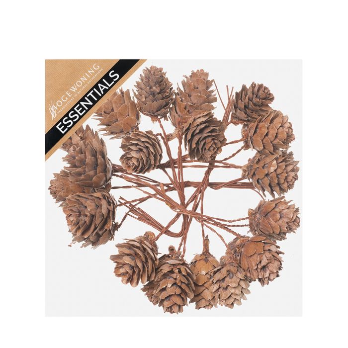 Kottar med snö på tråd. Brun kottar med snö som sitter på en liten metalltråd som stam. Det finns 35 stycken i en låda.