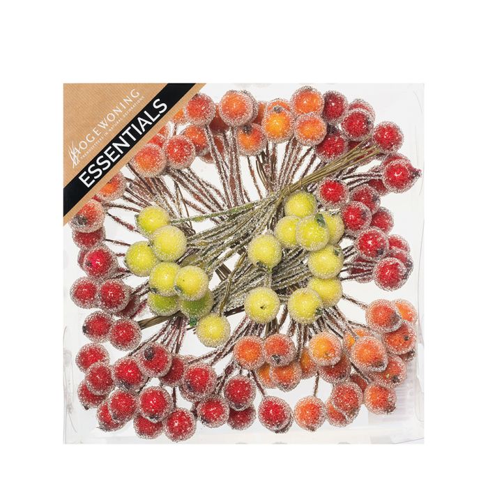 Frostade bär på tråd mångfärgade. De små mångfärgade bären med "frost" sitter på en liten metalltråd för att sticka in i kransen, oasen, leran, jorden osv. Det finns 12 klasar med 10 bär vardera i en låda.