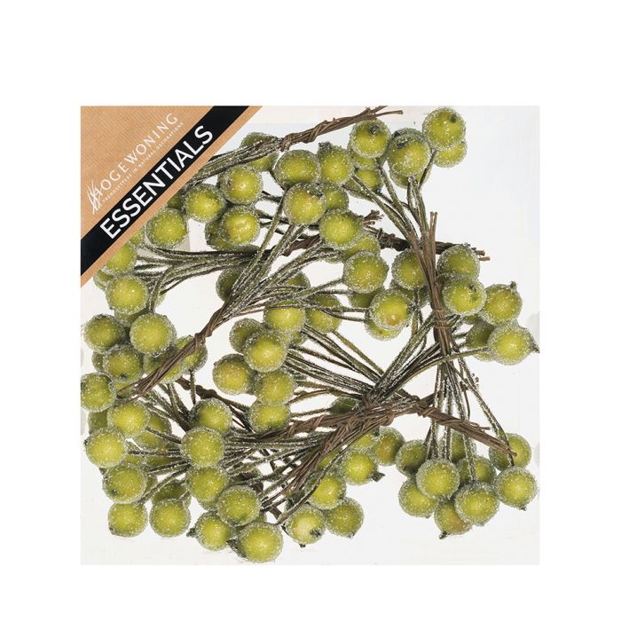 Frostade bär på tråd gröna. De små, gröna bären med "frost" sitter på en liten metalltråd för att sticka ner i kransen, oasen, leran, marken osv. Det finns 10 klasar med 12 bär vardera i en låda.