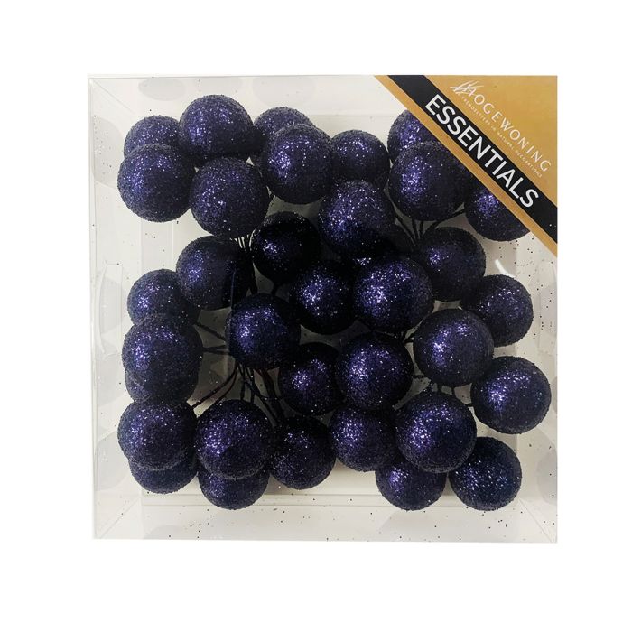 Glitterkulor på tråd mörkblå. Här är det glitter, fest och färg med dessa runda dekorationsbollar. De sitter på en 9 cm lång tråd. I lådan finns 6 kluster med 6 glitterkulor i varje. Totalt 36 glitterkulor.