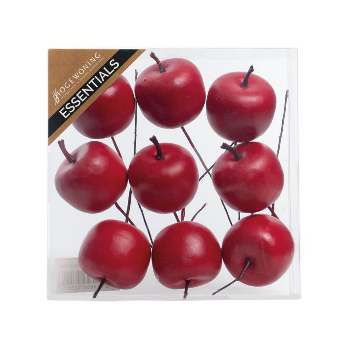 Röda äpplen på tråd. Röda äpplen med liten stjälk och en metalltråd för att sticka in i kransen, oasisen, leran, jorden etc. Äpplena är 4 cm i diameter. Det finns 9 äpplen i en ask.