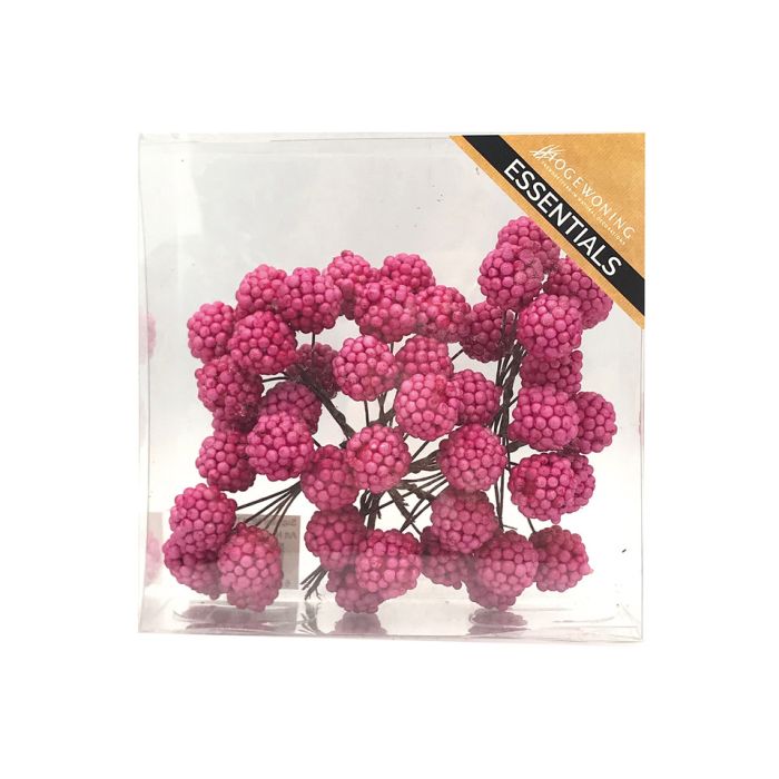 Rosa skogsbär på tråd. Små, rosa konstgjorda skogsbär med en metalltråd för att sticka in i kransen, oasisen, leran, jorden etc. Skogsfrukterna sitter i kvistrar om 8 stycken. Det finns 5 kvistrar i en låda.