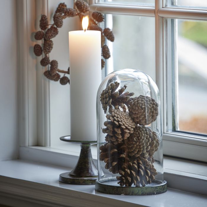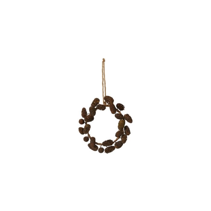 Fin, liten, dekorativ kottekrans med mörkbruna kottar och snöre för upphängning. Kransen är från Speedtsberg och finns i tre storlekar. Kan till exempel hängas i fönstret eller användas som dörrdekoration.