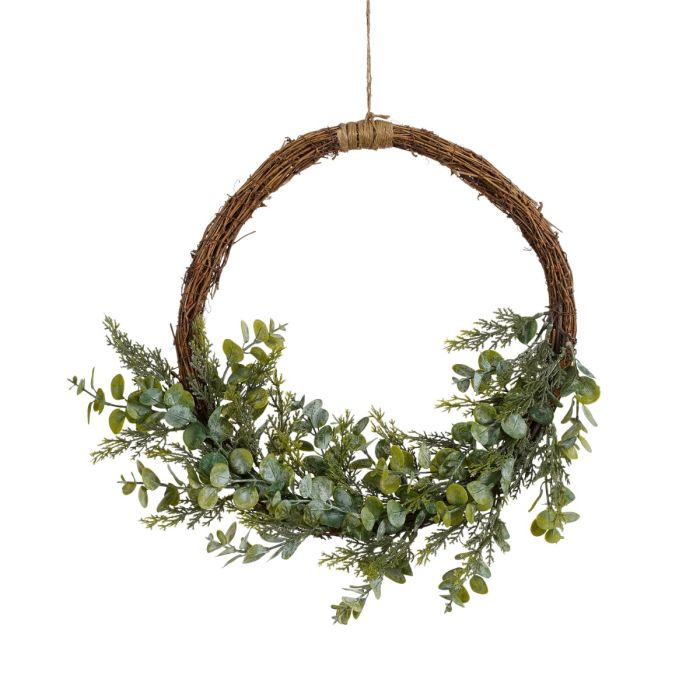 Dekorativ krans i vriden pil dekorerad med konstgjorda gröna utväxter. Kan till exempel hängas i fönstret eller på dörren.