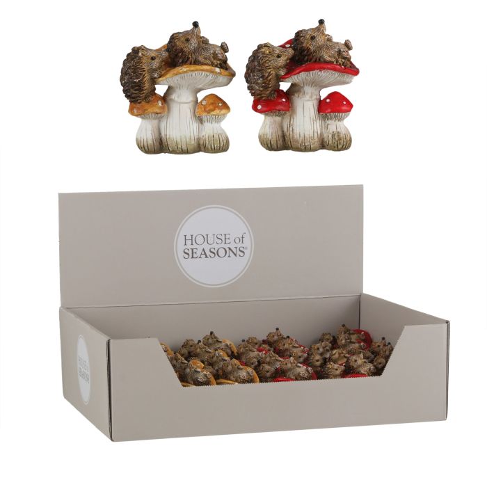 Svamp med igelkott. Svampar med igelkottar finns i 2 varianter med röda eller gula svampar. Tillverkade av polyresin. Mäter 8 cm i höjd.