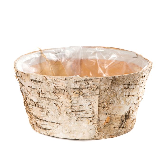 Kruka i björkbark med diameter på 19 cm. Snygg och naturlig kruka i björkbark fodrad med plast. Krukan är även lämplig för juldekorationer.