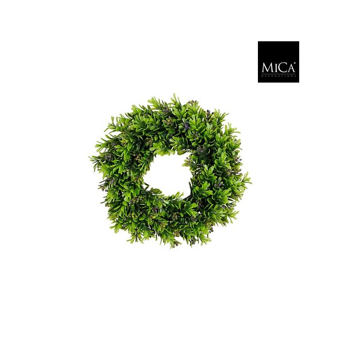 Tät, grön buxbomskrans med mörklila färger runtomkring. Kransen kan användas hängande som dörrkrans eller liggande med till exempel ett ljus i mitten. Mycket dekorativ året runt, både inomhus och utomhus.