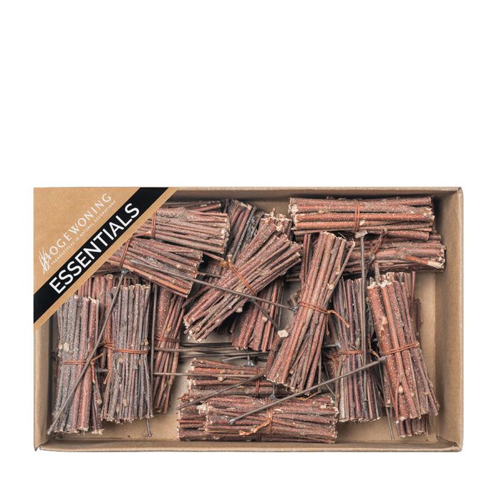 Små knippen av björkkvistar med tråd att sätta i kransar, dekorationer eller för landskap. Det finns ca. 24 st. i en låda. Buntarna är 6 cm långa.
