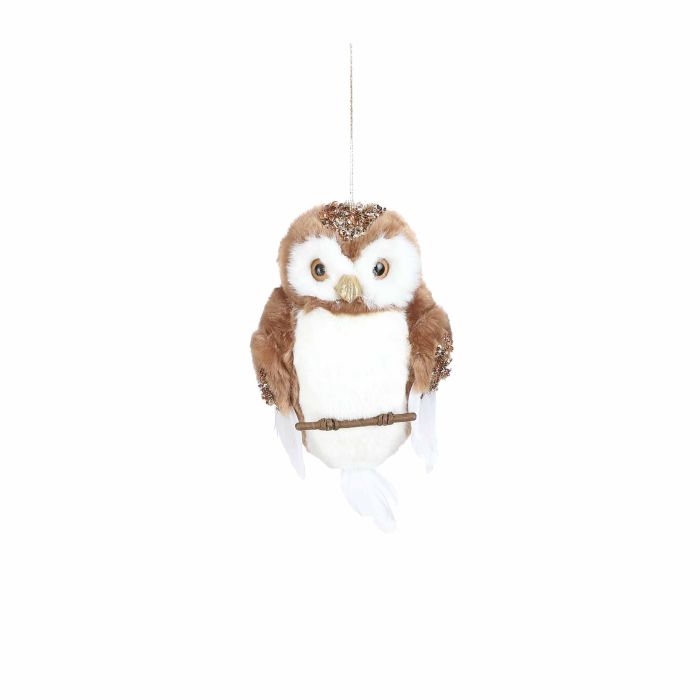 Uggla vit/brun. Söt uggla med päls som sitter på en pinne. Ugglan har en snöre för upphängning.