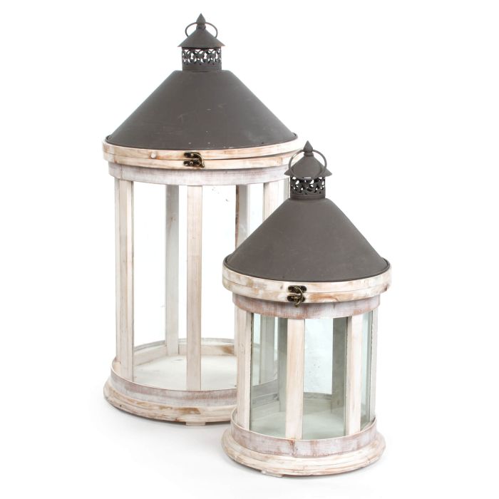 Lyktset med lyktor i två storlekar. Lyktorna är gjorda av trä med glas på sidorna och metall upptill. Superfina med sin rustika look och runda form.