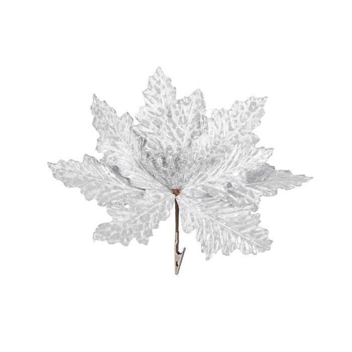 Silverfärgad julstjärna med klämma. Stor silverfärgad julstjärna med glitter på några bladen. Julstjärnan har en klämma som gör det enkelt att placera den.