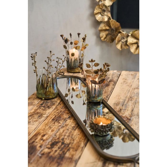 Den här stora spegelbrickan från Speedtsberg är en dekorativ detalj som skapar en vacker och harmonisk bas i hemmets inredning. Brickan har en lång och elegant form med kanter i antikkopparfärg och diskreta handtag som ger ett sofistikerat uttryck. Med en längd på hela 124 centimeter och en bredd på 21 centimeter finns der gott om plats till ljus, gröna växter, vaser eller noggrant utvalda dekorationer. Spegelglaset fångar och reflekterar ljuset på ett mjukt sätt och bidrar till en varm och stämningsfull atmosfär. Brickan passar lika bra på ett långt matbord som på en bänk, en fönsterkarm eller en byrå, där den fungerar som en vacker grund till både vardagsdetaljer och säsongens pynt. En stilren och generös spegelbricka som inspirerar till kreativ styling och skapar en sammanhållen och elegant känsla i hemmet.
