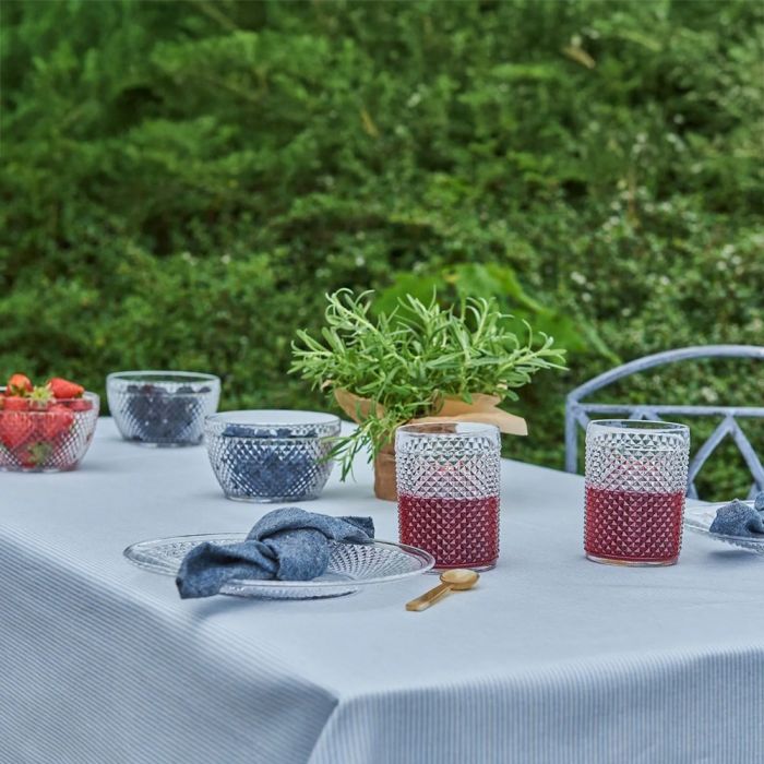 Bordsduk av god kvalitet med ljusblå och vita ränder. Duken kan användas både på matbordet eller utomhus på trädgårdsbordet. En klassisk och tidlös design som aldrig går ur modet. Duken är från Speedtsbergs serie av sommartextilier, inklusive tygservetter, kökshanddukar och textila vaxdukar.