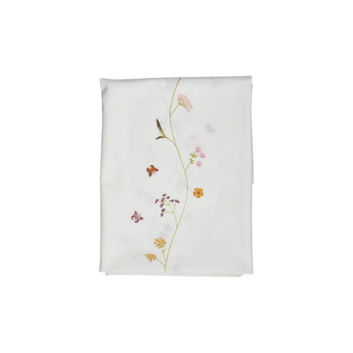 Somrig duk med en blomranka med fjärilar i mitten. Duken är vit med coated yta och är från Speedtsberg. Sommarduken är praktisk då den är både vattentät och smutsavvisande. En fin detalj till till exempel trädgårdsbordet.