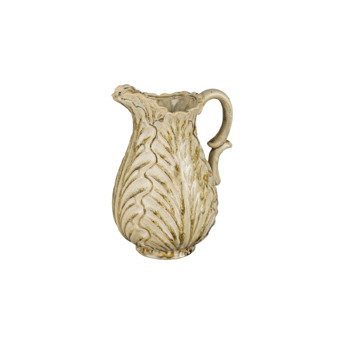 Mycket dekorativ, beige keramikkanna med bladliknande, guldfärgat mönster. Kannan kan användas till både kalla och varma drycker eller fyllas med en bukett blommor.