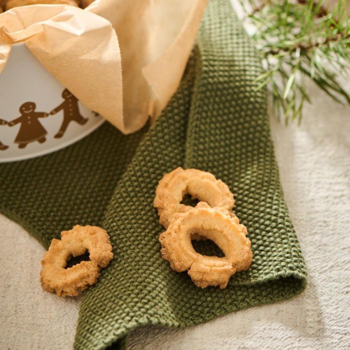 Stickad handduk från Ib Laursens populära Mynte-serie i en olivgrön nyans. Handduken är tillverkad av 100 % ekologisk bomull och i en härligt mjuk kvalitet som absorberar väl. Storleken gör den idealisk som köks- eller gästhandduk i badrummet.