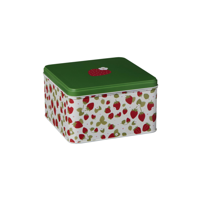 Fyrkantig platt burk med solmogna jordgubbar och vita jordgubbsblommor som motiv och grönt lock med en enda jordgubbe som dekoration. Burken är helfärgad benvit inuti. Idealisk för förvaring av till exempel bakverk. Burken är från Ib Laursen och finns i flera storlekar.