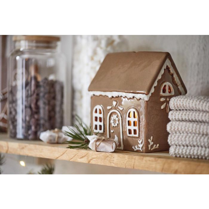 Kom i riktig julstämning med detta vackra keramikhus från Ib Laursens populära Stillenat-serie. Huset är utformat som ett brunt pepparkakshus med fina vita "glasyr"-detaljer, vackert rundade fönster och en dörr med dekorativ dörrkrans. När du placerar ett värmeljus eller en ljusslinga inuti sprider sig ljuset stämningsfullt genom de små fönstren och skapar en varm och mysig glöd. Den speciella glasyren ger varje hus ett unikt och levande uttryck inga två är exakt likadana. Använd huset som en dekorativ detalj på egen hand eller kombinera flera för att skapa en charmig liten julby fylld med magisk julstämning.