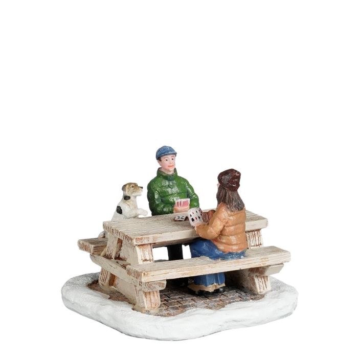 Vid den lilla bordsbänken spelas det ena kortspelet efter det andra. Hunden får dock nöja sig med att titta på.