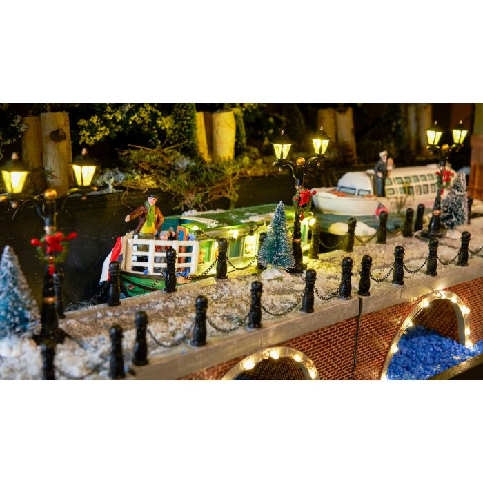 Två svarta, breda gatlyktor dekorerade med julkransar. Lamporna sitter på samma tråd. Ger mysig belysning i jullandskapet.