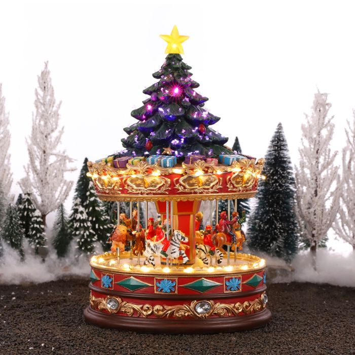 Julkarusell med barn som rider på djur och med en stor julgran ovanpå karuselltaket från Luville Specials. Karusellen har lampor i de två ljuskedjorna och i den översta stjärnan.