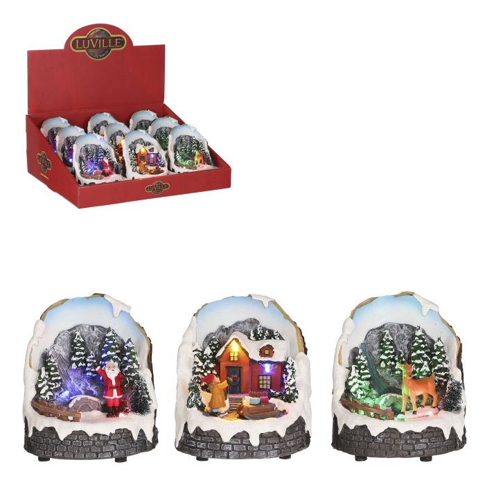 Mini vinterlandskap med 3 olika motiv. Alla varianter har ljus. Använder 2 x 1,5 V AAA-batterier, batterier ingår ej. Mått L: 11 cm x B: 10 cm x H: 12,5 cm. Tillverkad av polyresin.