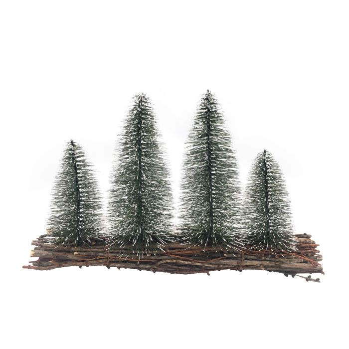 Fyra barrträd med vitt "snöstänk" på basen av bunt tunna kvistar. Bra som avskiljning i jullandskapet eller som dekoration med figurer, till exempel på fönsterbrädan.