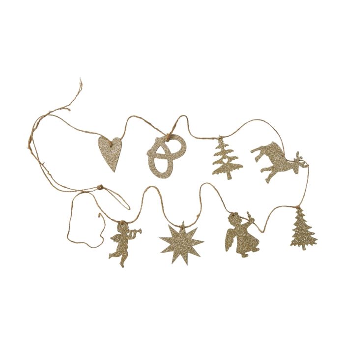 Girlang med julmotiv skurna i trä och målade med guldglitter. Det finns 8 olika motiv på girlangen. Snyggt och dekorativt t.ex. på granen, i fönstret eller i dörröppningen. Julgirlangen är från Speedtsbergs julkollektion.