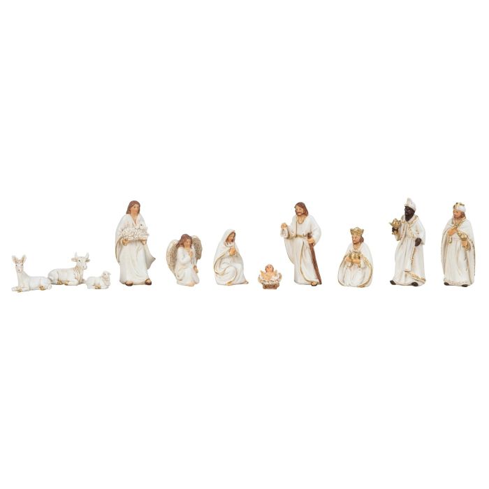 Det här vackra julkrubbssetet i vita och gyllene toner för in julens berättelse i hemmet på ett stämningsfullt och elegant sätt. Alla elva figurer är tillverkade i polyresin och målade med fina detaljer som ger helheten ett varmt och harmoniskt uttryck. De mjuka färgerna skapar ett lugnt och balanserat blickfång som passar fint i både traditionella och moderna julmiljöer.