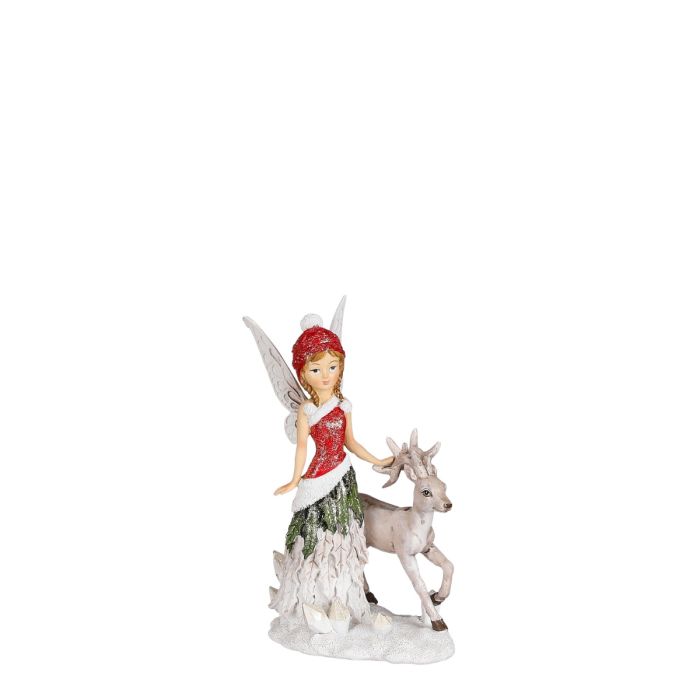 Fe med fjärilsliknande vingar, kläder i julfärger och med bladskört. Hon går bredvid en vit rådjur på den iskalla vintermarken, där snöflingor sticker upp. Mysig jul- och vinterfigur från den nya serien med älvor.