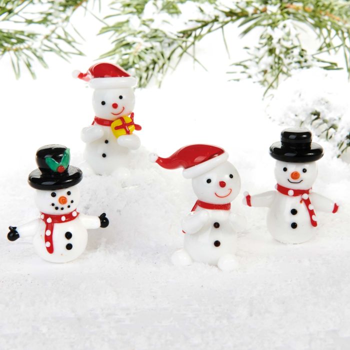Glasfigurer formade som snögubbar. Snögubbarna bär antingen höga, svarta hattar eller nissehattar.