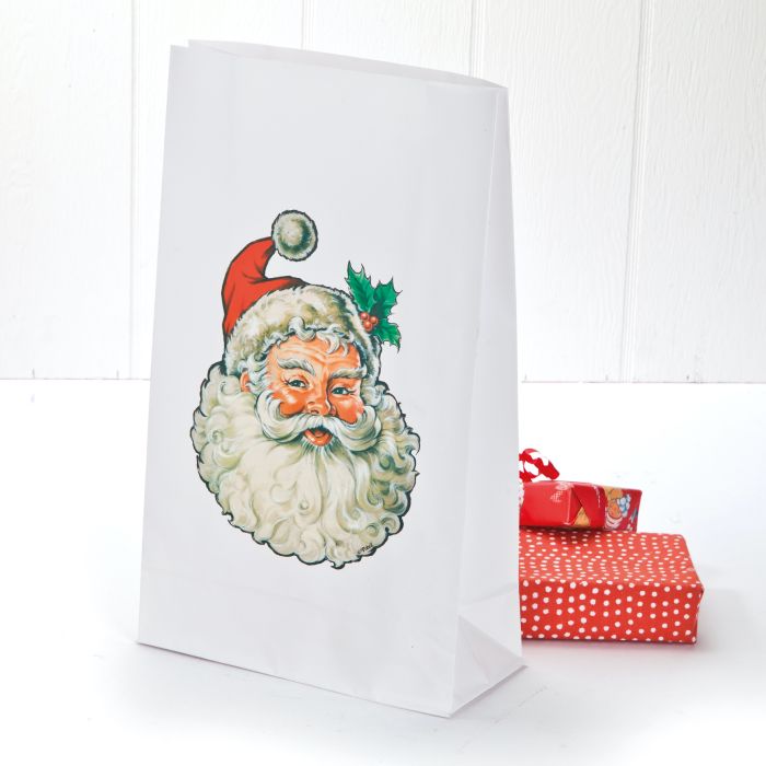 Julpåse är gjord av vitt papper med jultomtens huvud. Påsarna kan användas både som presentpåsar eller som stora godispåsar.