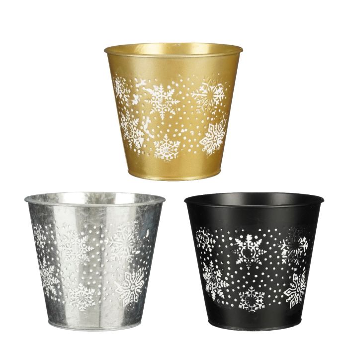 Mysiga ytterkrukor från Mica Decorations. De är utförda i tre klassiska färger: svart, guld och silver, och dekorerade med ett fint vitt snöflingemönster som ger ett vinterligt uttryck. Ytterkrukan passar perfekt till mindre krukväxter men kan också användas som en dekorativ behållare för julgrenar, blockljus, konstgjorda julgranar eller juldekorationer.