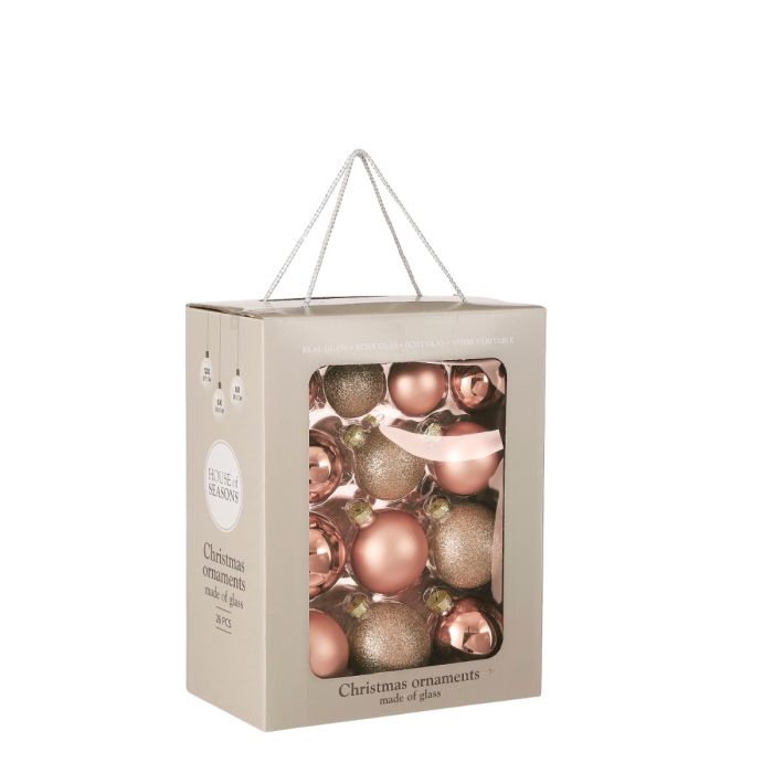 Julkulorna 26-pack i persika nyanser. Julgranskulorna finns i 3 varianter: matt, glitter och blank. Julgranskulorna i glas pryder vackert i fönstret. Eller dekorera granen med de 26 julgranskulorna – det ger ett elegant och stämningsfullt uttryck. Finns i många andra härliga färger och kan kombineras.