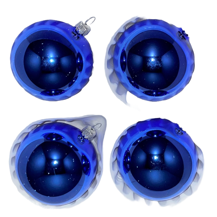 Julkulor i glänsande blått med en diameter på 7 cm. Julkulorna är munblåsta, handmålade och gjorda av äkta glas på Glasbläserei Thüringer Weinachten.