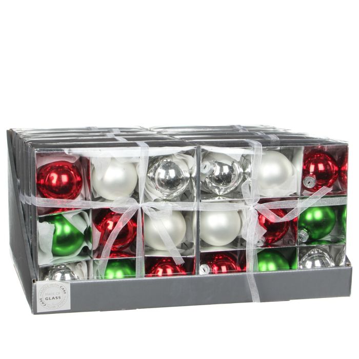 Julekugler i 9-pak fremstillet i glas. Julekuglerne har en diameter på 6 cm.