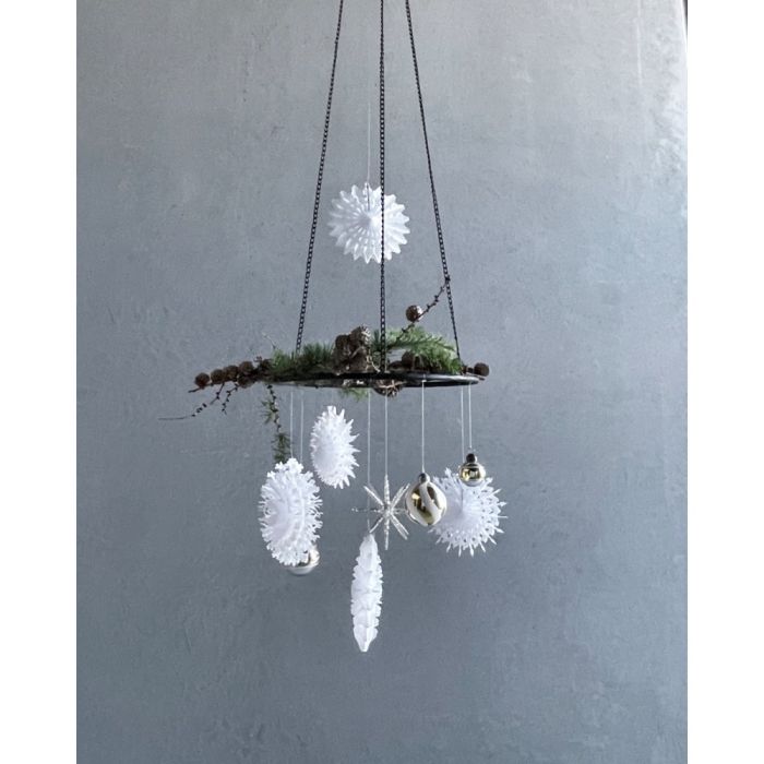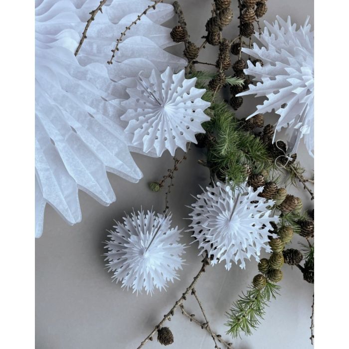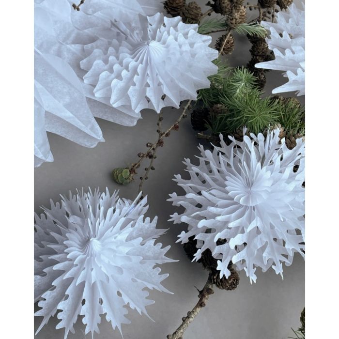 Handgjorda, dekorativa vita pappersstjärnor med en touch av vinterns vackra snöflingor från House Doctor. Prydn fönstret, julgranen, kransen, häng dem från taket eller på en gren och låt de vackra pappersdekorationerna vecklas ut på sitt finaste sätt.