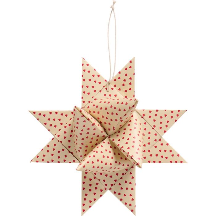 Stor, klassisk flätad julstjärna i naturfärgat papper med små mörkröda hjärtan. Stjärnan har ett snöre för upphängning och kan hängas vackert i fönstret eller från taket. Den sprider en mysig och nostalgisk julstämning i hemmet och är en tidlös dekoration som återkommer år efter år. Julstjärnan är en del av Ib Laursens populära Stillenat-serie och finns i flera storlekar, så att du enkelt kan kombinera flera och skapa en harmonisk och stämningsfull juldekoration.