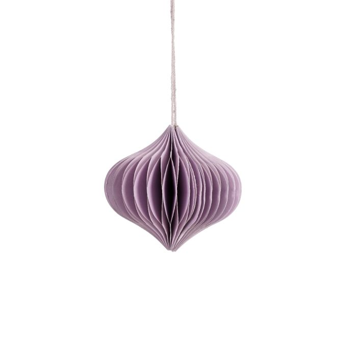 Lökformad pappersdekor i fin lila färg. Pappersdekorationen är gjord av återvunnet papper. Den fälls ut och stängs med en liten magnet. Det finns ett snöre i den. Finns i många former och färger.