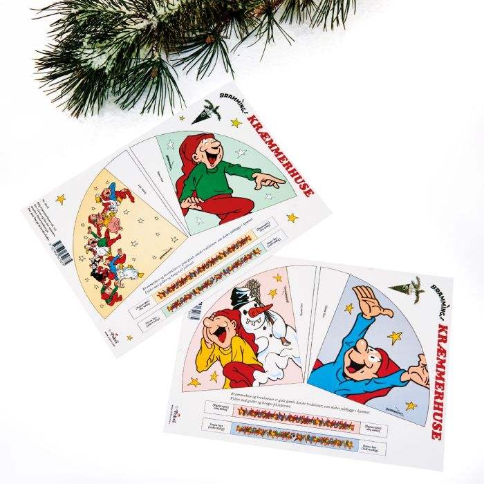 2 ark med två godispåsar/strutarpå varje ark med handtag redo att klippas ut och monteras med lite lim eller tejp. Godispåsar/strutar har glada Bramming tomtar på sig.