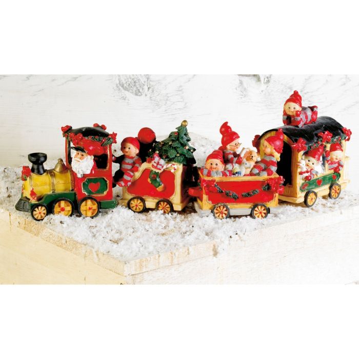 Alla ombord på juletåget! Bäbistomtarna har satt sig bekvämt i det färgglada jul-loket och de tre festligt dekorerade vagnarna där julstämningen rullar på för fullt. Här vinkas det, läses sagor och myst med julklappar, gran och små tomtevänner. Loket körs av jultomten själv, medan de glada bäbistomtarna njuter av resan genom det snötäckta vinterlandskapet. Hela tåget, lok, tre vagnar och alla små tomtar, kommer som ett komplett set i polyresin, med många fina detaljer och klara färger som fångar känslan av tradition, lek och klassiskt julmys. Bäbistomtarna är designade av Susanna Hartmann för danska Pobra, kända för sitt älskade och nostalgiska tomteuniversum med tomtar i rött och grått. Ett sagolikt julelement som sprider glädje och värme i hemmet. Perfekt i ett tomtelandskap, på en hylla eller som en fin mittpunkt i juldekorationerna.