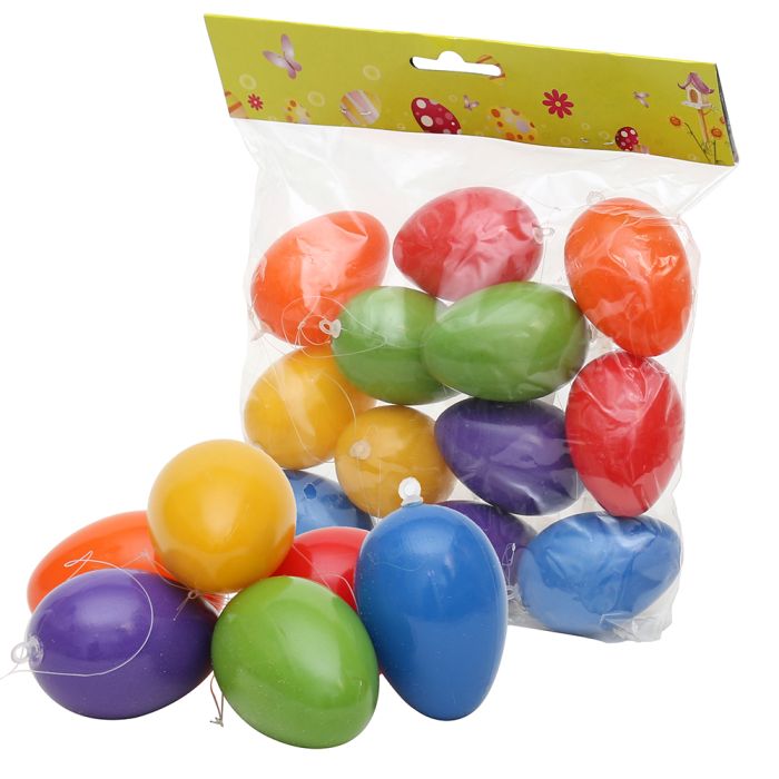 Påskägg av plast i rena färger med snöre för upphängning. Äggen är lämpliga att hänga ute och sätta lite färg på buskarna.