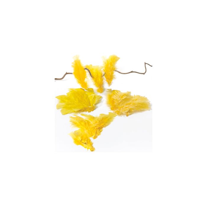 Gula och orange fjädrar. Påse med en blandning av gula och orange nyanser av fjädrar. Fjädrarna är cirka 15 cm långa. Det finns 10 fjädrar i varje påse.